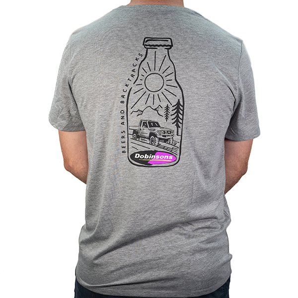 Dobinsons quality grey 'Beers & Backtracks' T-Shirt featuring a 79 Series Landcruiser